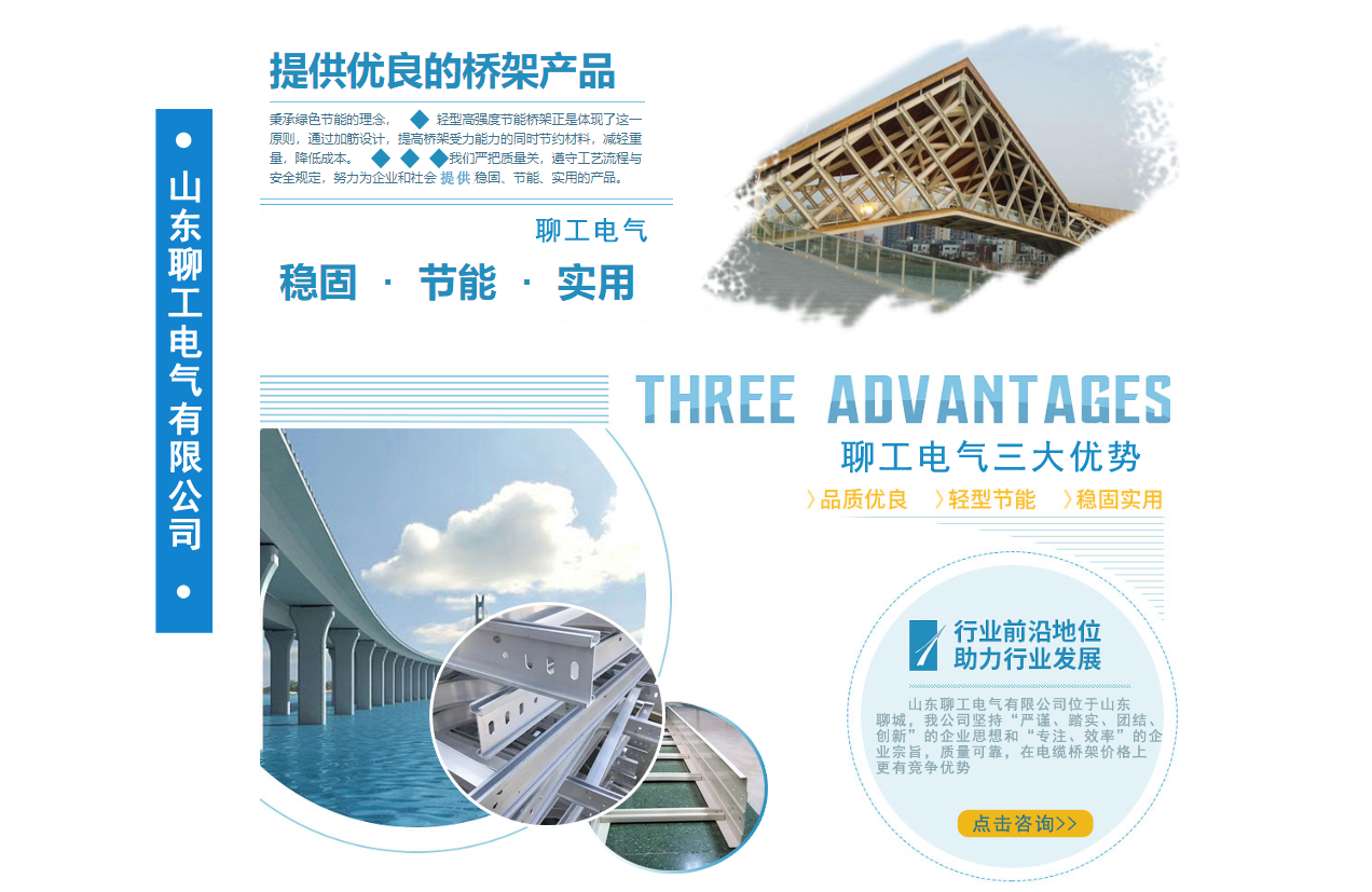 山東聊工電氣有限公司位于山東聊城,是一家銷售各類橋架的公司,公司主營鍍鋅防火噴塑橋架,鍍鋅防火電纜橋架 ,不銹鋼電纜橋架,熱浸鋅電纜橋架,鋁合金電纜橋架,熱鍍鋅電纜橋架,梯式電纜橋架等我公司堅持“嚴謹、踏實、團結、創(chuàng)新”的企業思想和“專注、效率”的企業宗旨,質量可靠,在電纜橋架價格上更有競爭優(yōu)勢。公司追求品質,配有研發(fā)人員,進行產品的改革和創(chuàng)新,服務先進走出了一條富有企業特色的可持續(xù)化發(fā)展之路!    我公司鄭重向你承諾:保證最好的質量,以低的價格,完善的售后服務,來答謝新老客戶。可提前電話聯系。...